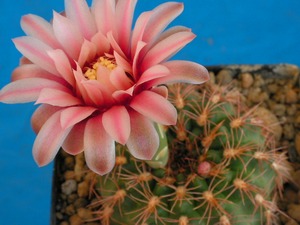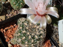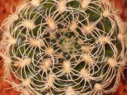 niebieskawo-zielony, 6 cm śr., 4 cm wys. Areole okrągłe z białą wełną. Ciernie promieniste, zakrzywione