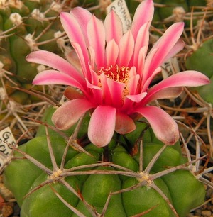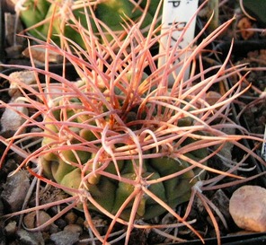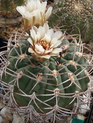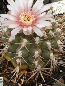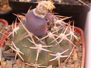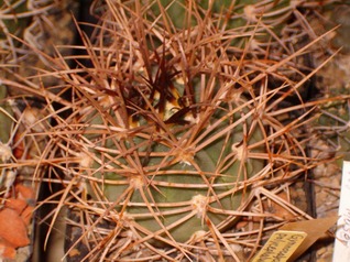 Typowa roślina jest płasko-kulista, później kulista, zielono-brązowa z 13 żebrami. Areole z biało-szarą wełną.
