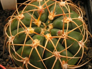 kolor zielony, połyskliwy. Żebra wydatne, 7-12, guzki wyraźne. Areole z dość obfitą żółto-brązową