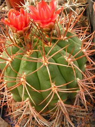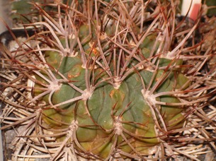 Żebra w liczbie 15. Areole z kremowo-żółtą wełną. Ciernie promieniste - 7 - ułożone